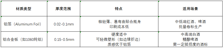 金屬鋁酒標牌常用兩種基材,需根據(jù)酒類定位匹配:
